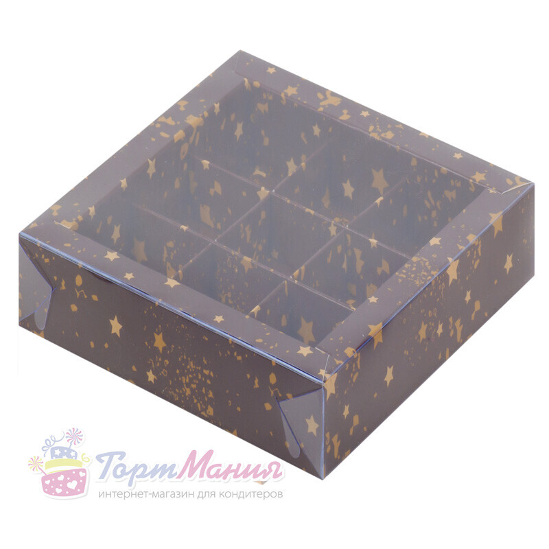 Коробка для конфет с пластиковой крышкой 155*155*30 мм (9) (коричневая со звездами)