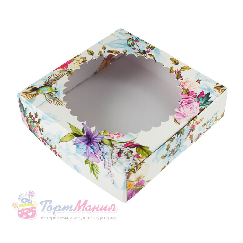 Коробка для печенья 12*12*3 см с окном "Цветы ассорти"