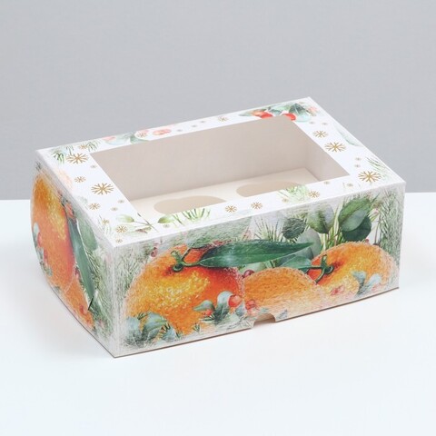 Коробка картонная на 6 капкейков "Апельсины" ,с окном, 25 х 17 х 10 см , 1 шт