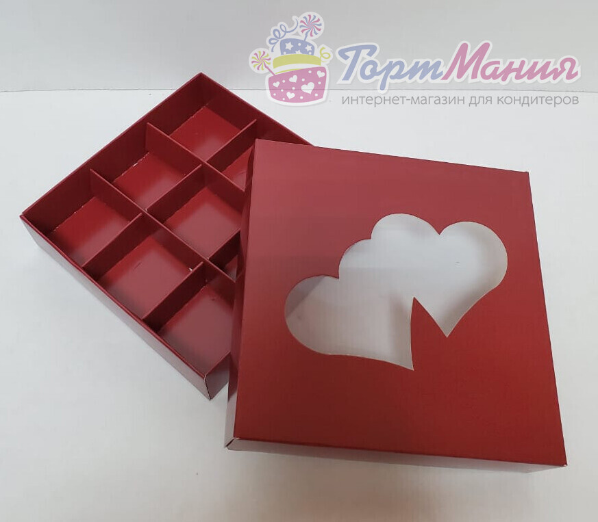 Коробка на 9 конфет с окном "Два сердца", 135х135х30, цвет бордовый