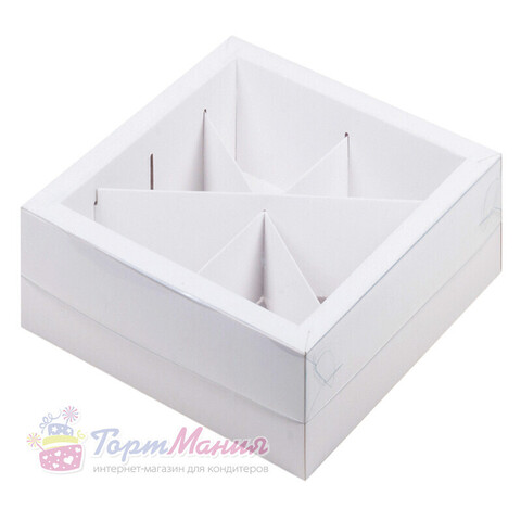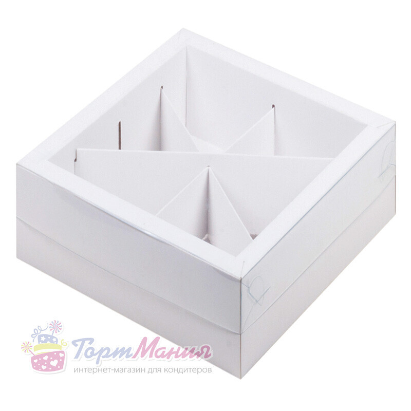 Коробка под ассорти сладостей с пластиковой крышкой 200*200*55 мм (4 или 6 ячеек) (белая)
