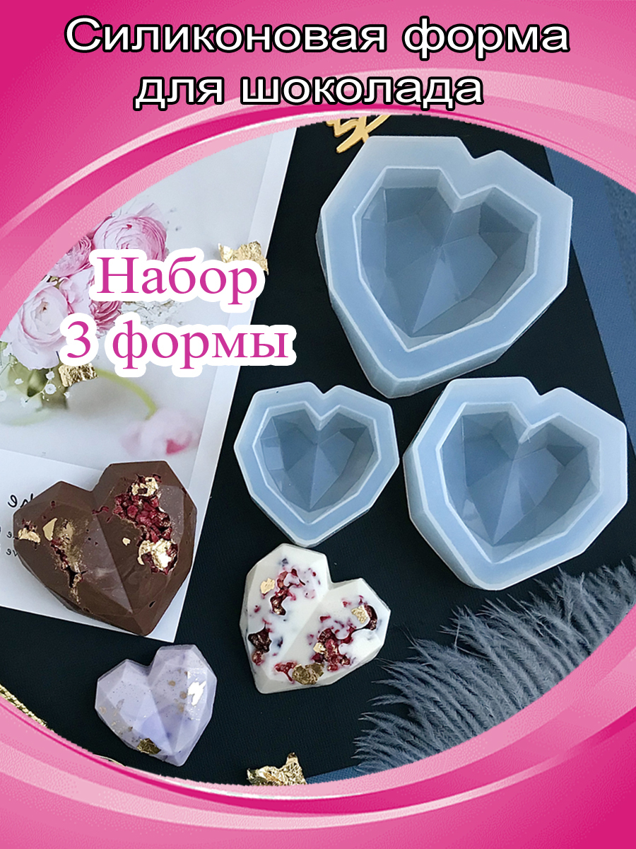 Описание NaTort | Артикул: MOLD0039 Наим.: Набор силиконовых молдов 3D «Сердечки с гранями» (3 штуки) Цвет: белый Состав: пищевой силикон 100% Страна: Китай |