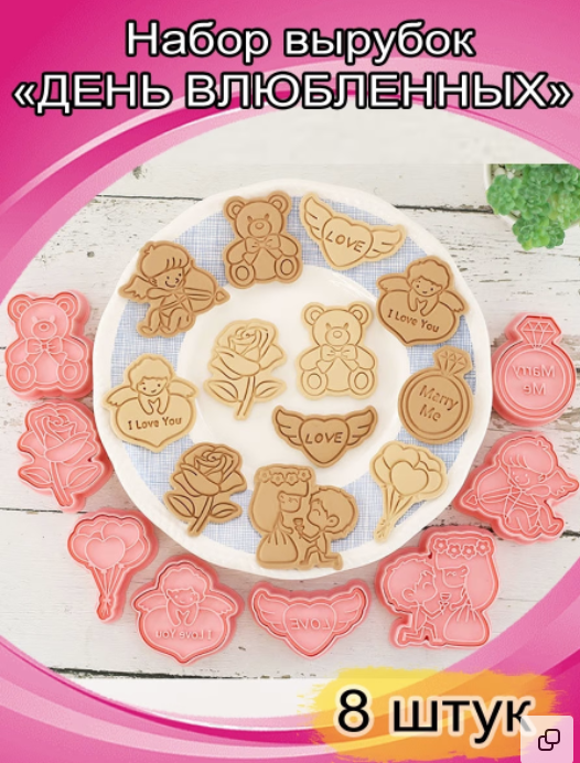 Описание для этикетки WB - ИП Наташа | Артикул: 11121681 Наим: Набор вырубок «День влюбленных» Цвет: розовый Состав: пищевой пластик Страна Китай |