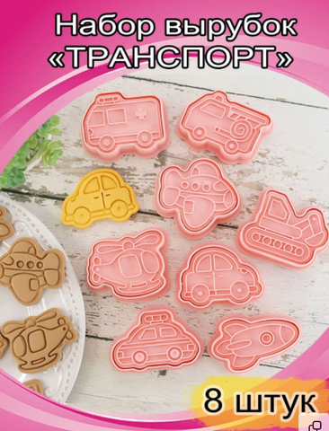 Описание для этикетки маркетплейса | Артикул: 11121677 Наим: Набор вырубок «Транспорт» Цвет: розовый Состав: пищевой пластик Страна Китай |