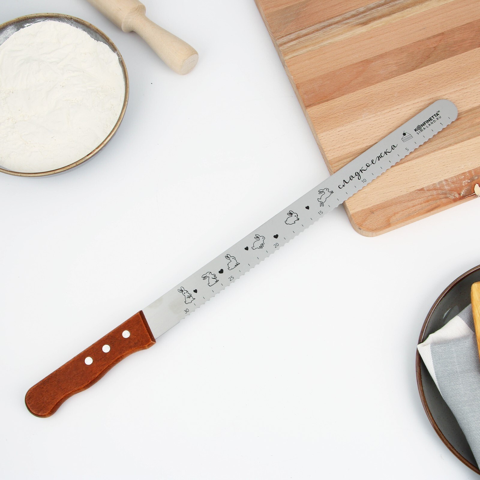 Нож для бисквита с гравировкой позволяет без крошек разрешать бисквит и значительно упрощает работу с ним.