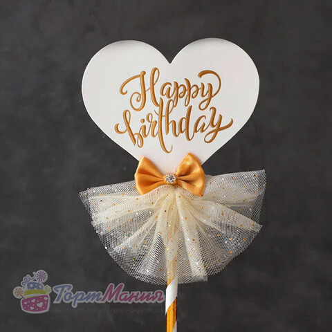 Топпер «Роскошь» Happy Birthday (сердце, белый с бантом)