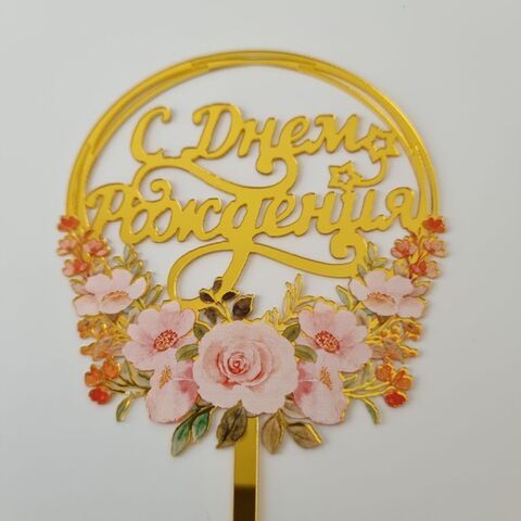 Топпер с цветами «С днем рождения» розовый букет, круглый