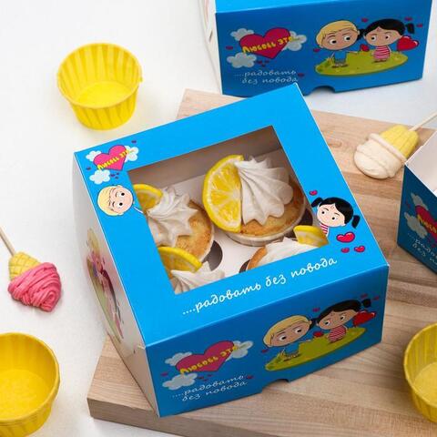 Упаковка на 4 капкейка с окном, "Любовь это…", голубая, 16 х 16 х 10 см