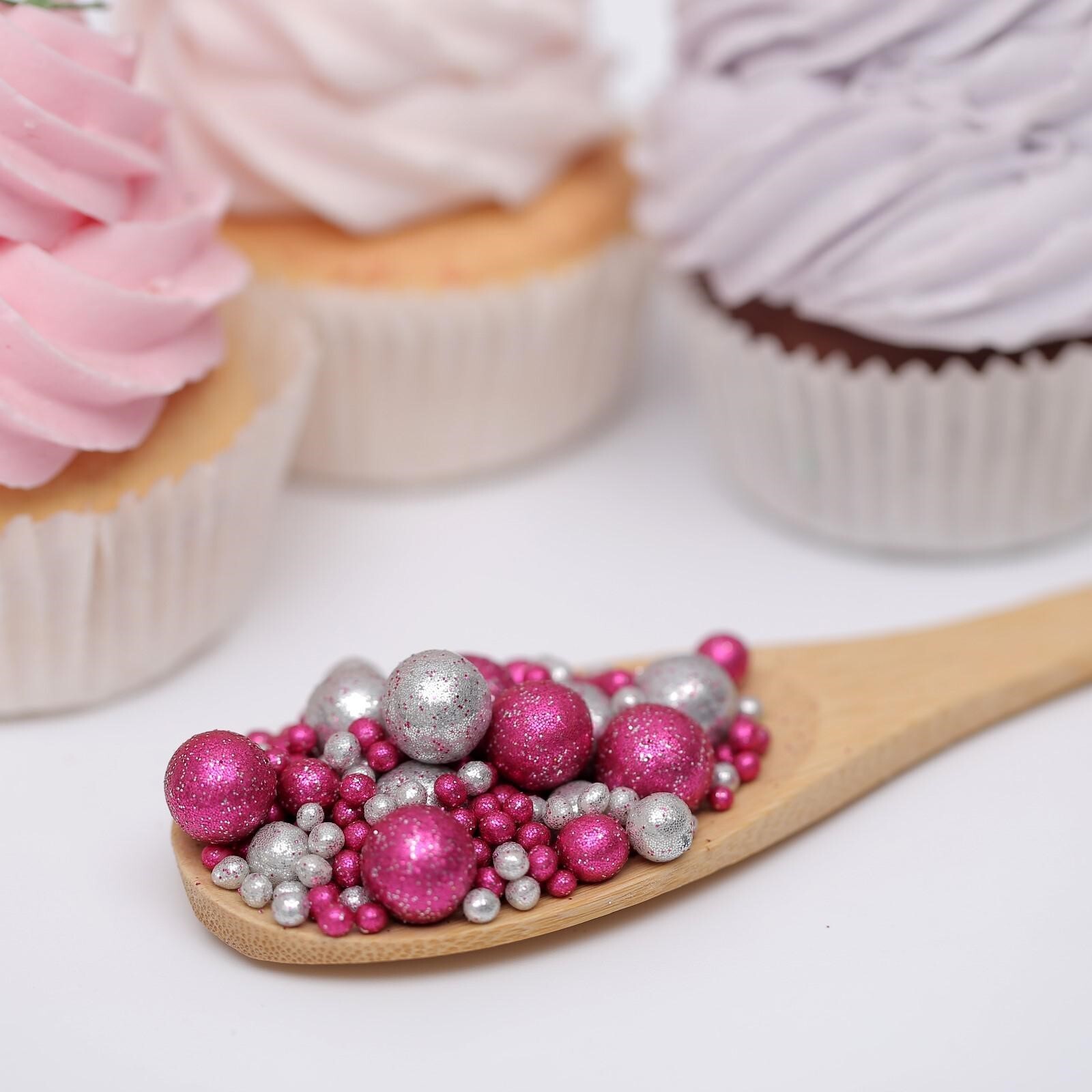 Воздушный рис в цветной кондитерской глазури, БЛЕСК серебро/фуксия, 50 г